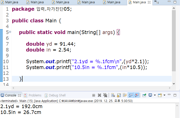 그 뒤에는 yd*2.1을 해주어서 yd라는 변수에 넣어줬던 값에 2.1을 곱한 값을 출력할 수 있습니다.
