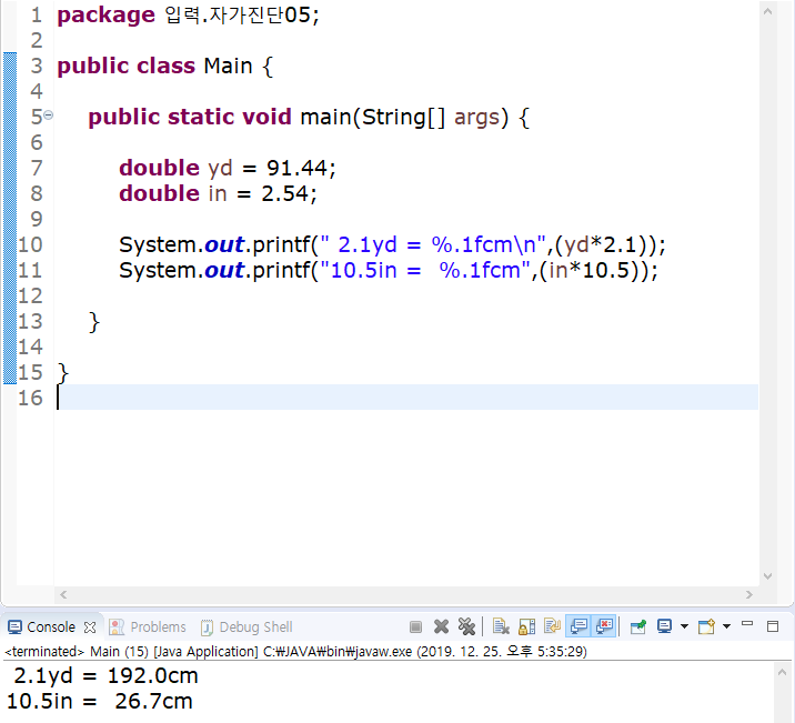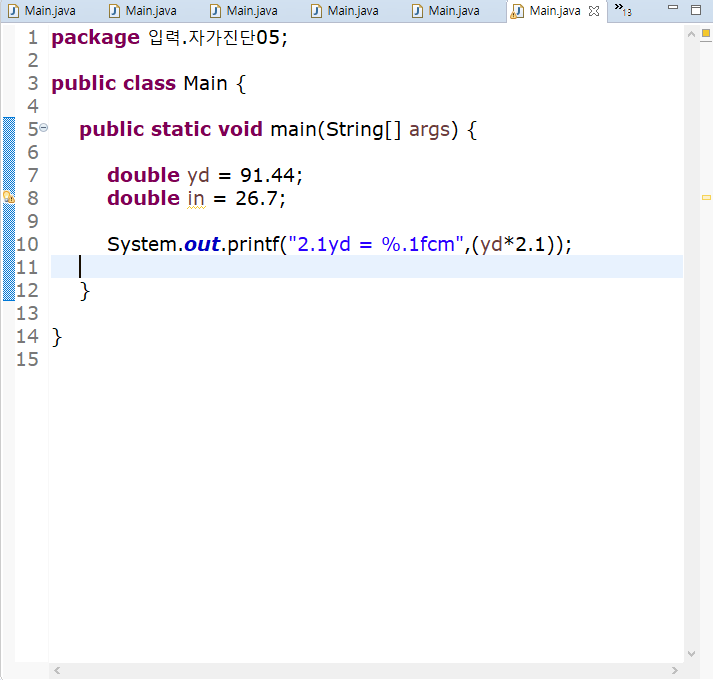 그 뒤에는 yd*2.1을 해주어서 yd라는 변수에 넣어줬던 값에 2.1을 곱한 값을 출력할 수 있습니다.
