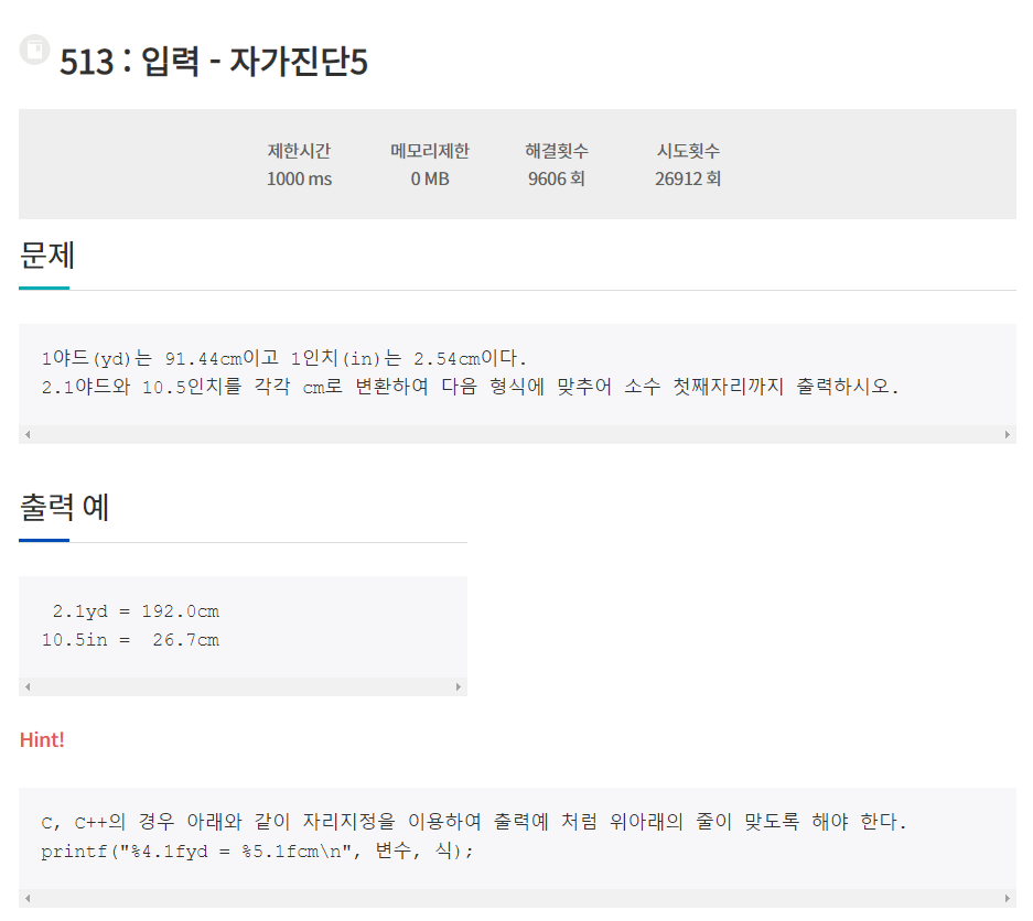 문제는 다음과 같이 야드(yd)와, 인치(in)값을 주고