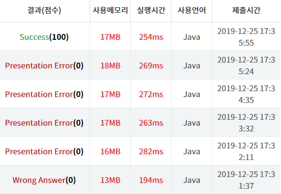 문제에 나온것과 동일하게 띄어쓰기를 해준 후 제출하여 정답을 받게 되었습니다.