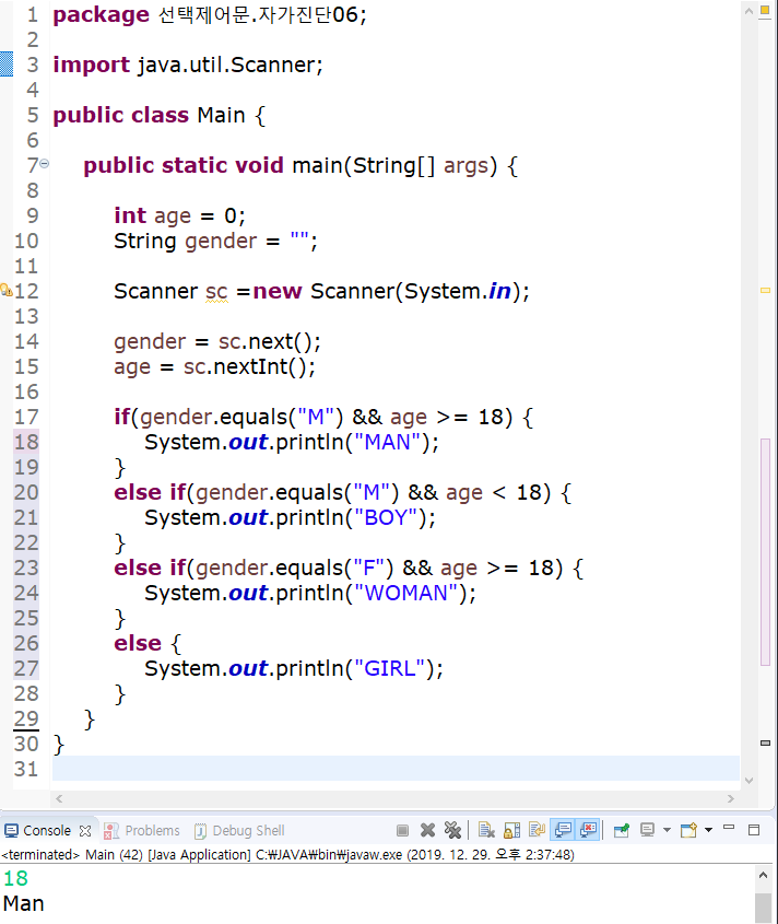 성인남자,여자,미성년남자,여자로 구분하여 출력하는 문제였습니다.