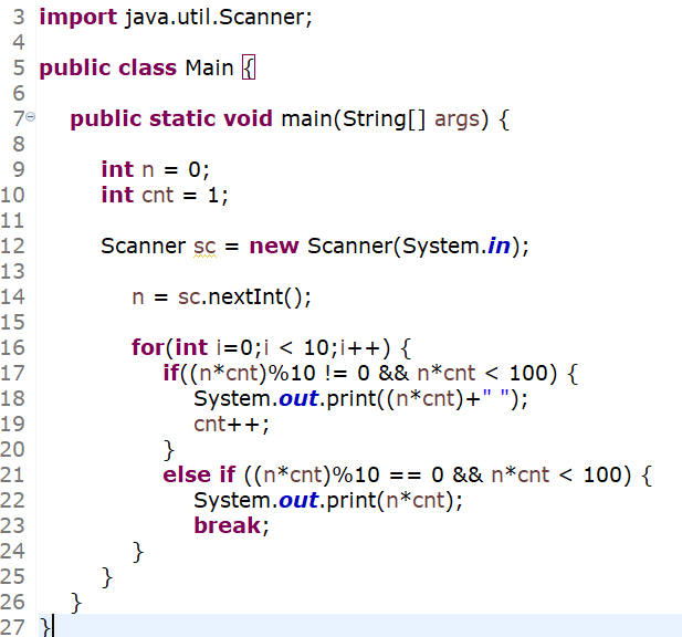 입력받은 값의 배수를 계속출력하여주고 10의 배수를 만나면 종료되기 때문에