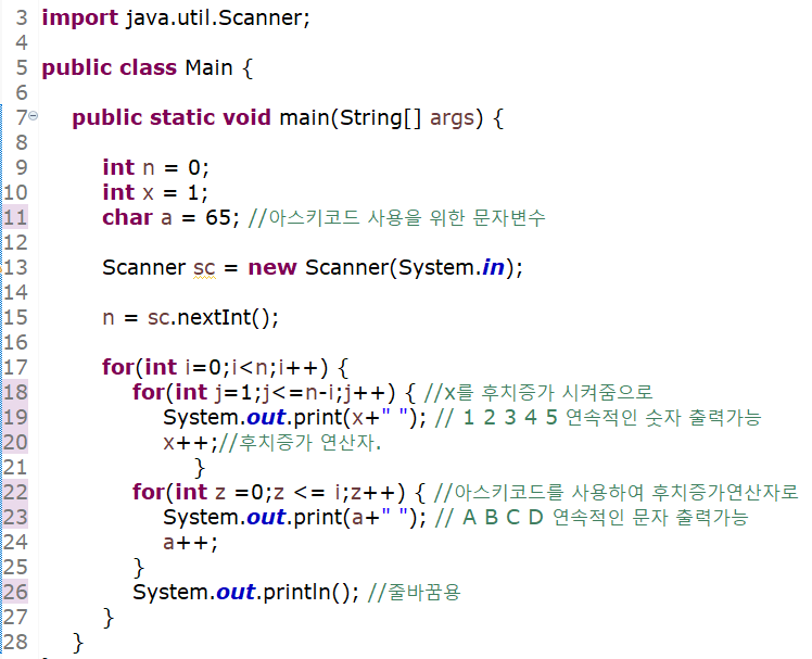주석에 표시해놓은 내용그대로 아스키코드와 증가연산자를 사용하여