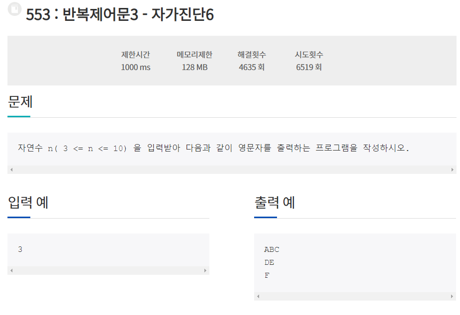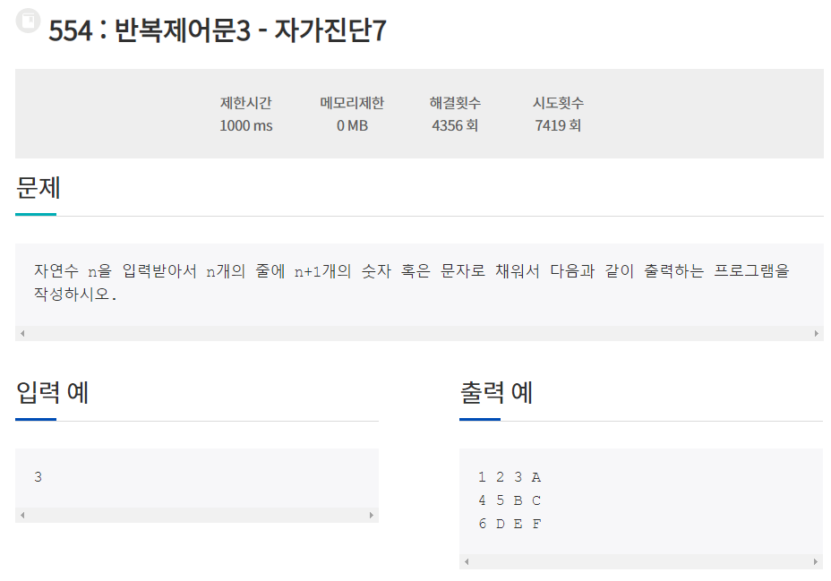 출력하여 줬으며, 숫자와 문자를 나눠서 출력해줘야 하기때문에 2중for문을 2번 사용하였습니다.