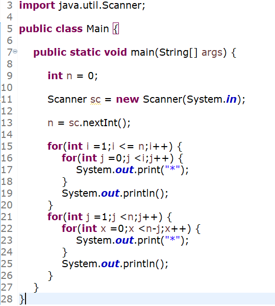 1차적인 for문으로 3줄을 형성하고 나머지 감소되는 2줄은 새롭게 for문을 부여하였습니다.