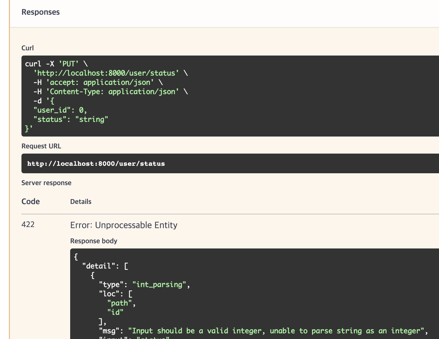 두 API는 HTTP Method가 동일하며 endpoint 또한 "/user/status"를 호출한다면 1번 함수를 호출하고 {id} 파라미터에 status를 입력한 것으로 인지하게 된 것이다.