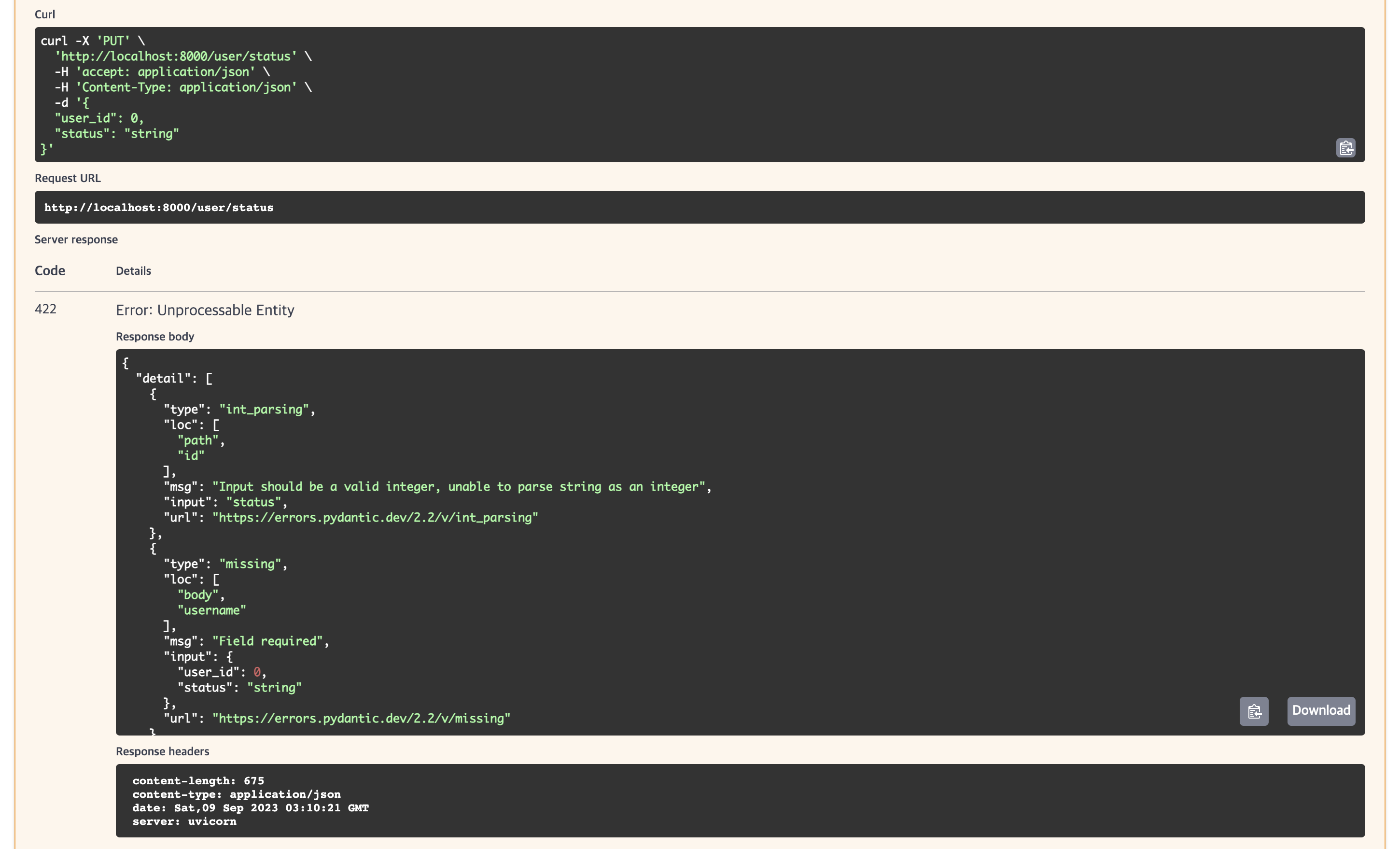 보통 API 요청 시 pydantic으로 정의되어 있는 Request Model에 어긋나기 때문에 발생하는데 그 외에도 endpoint, router 선언 기준/선언 순서에 따라 endpoint가 겹치는 현상이 발생하여 오류 추적이 어려울 때가 존재하여 그 내용을 정리하였다.