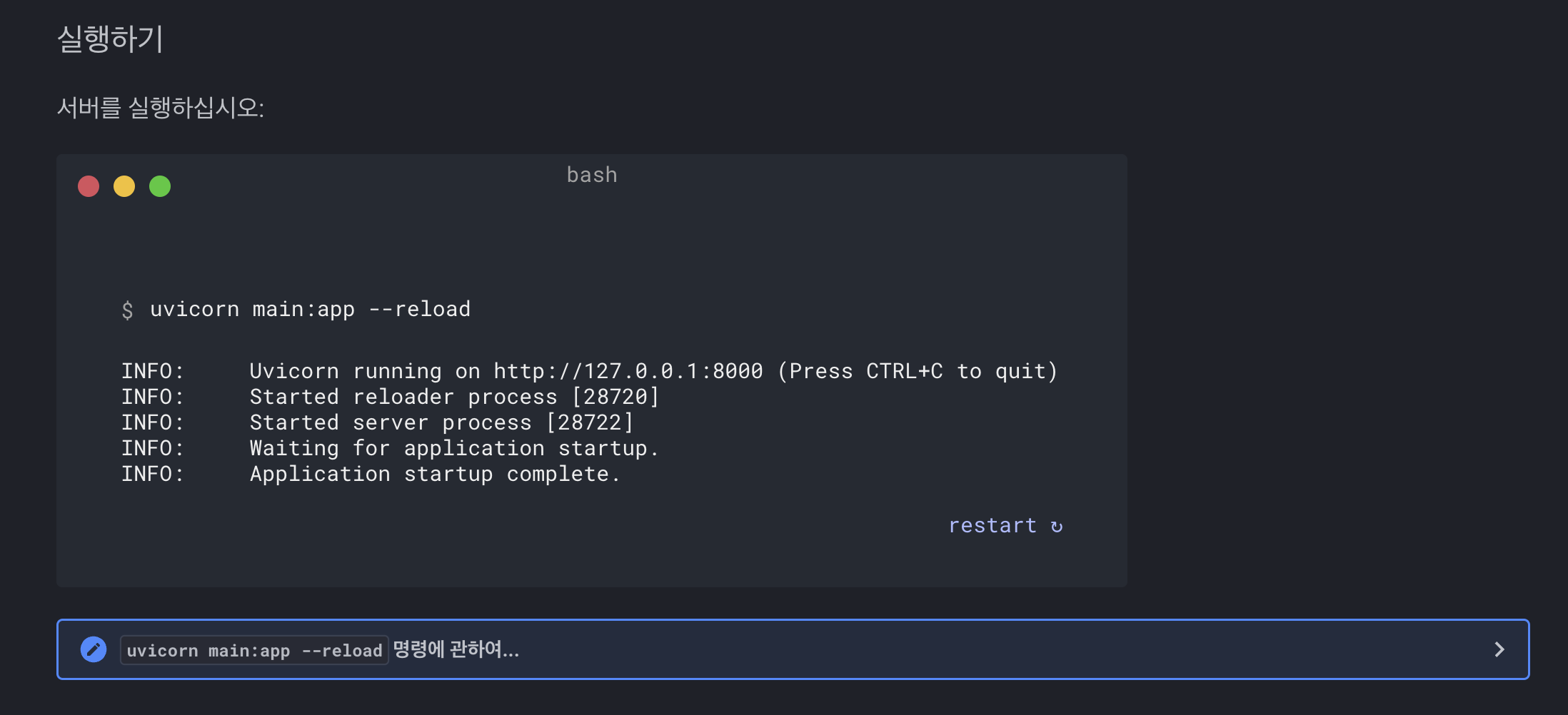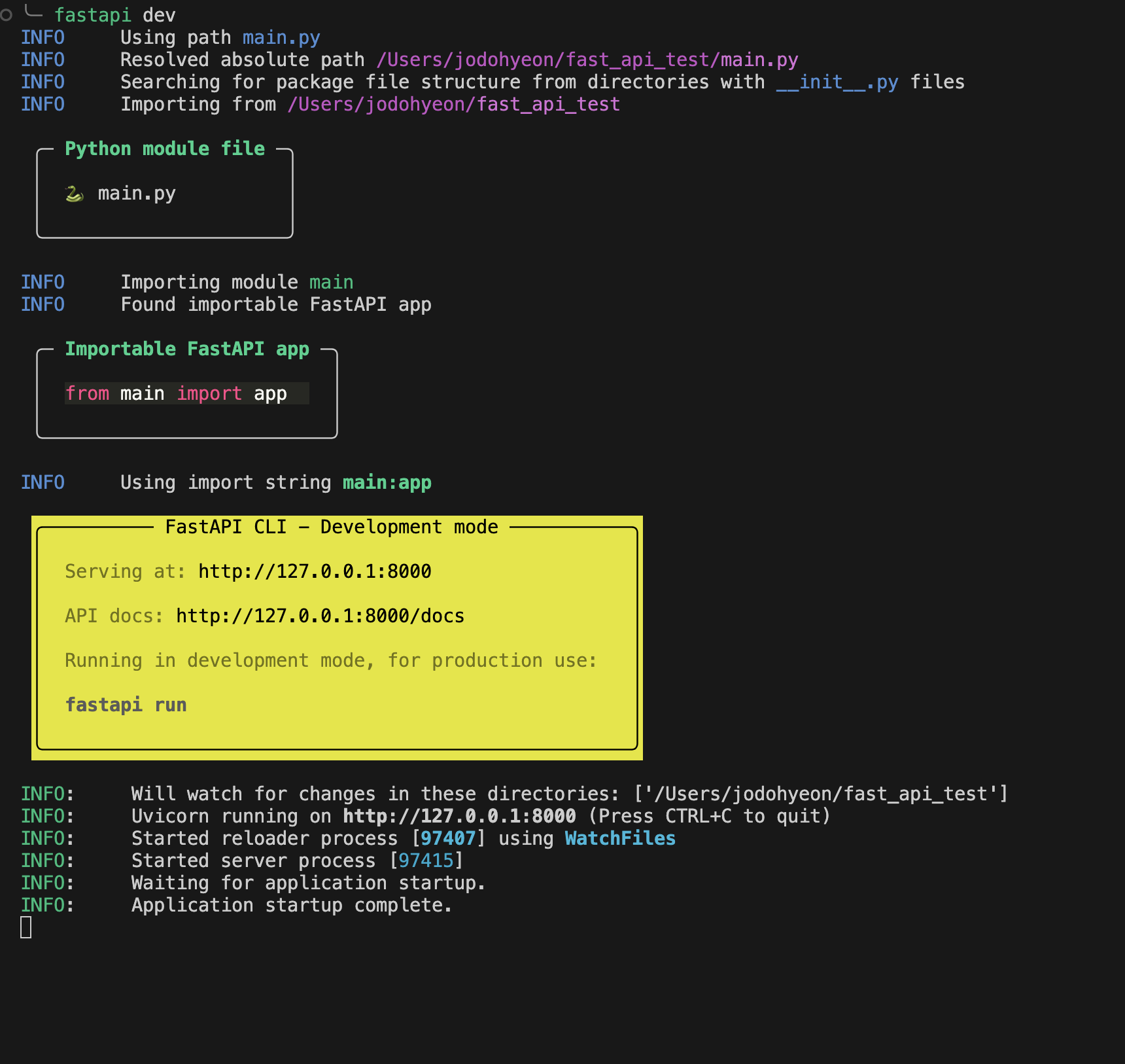 하지만, 현재는 추가된 CLI를 활용하여 보다 쉬운 명령어로 FastAPI 서버를 구동할 수 있게 된 것이다.