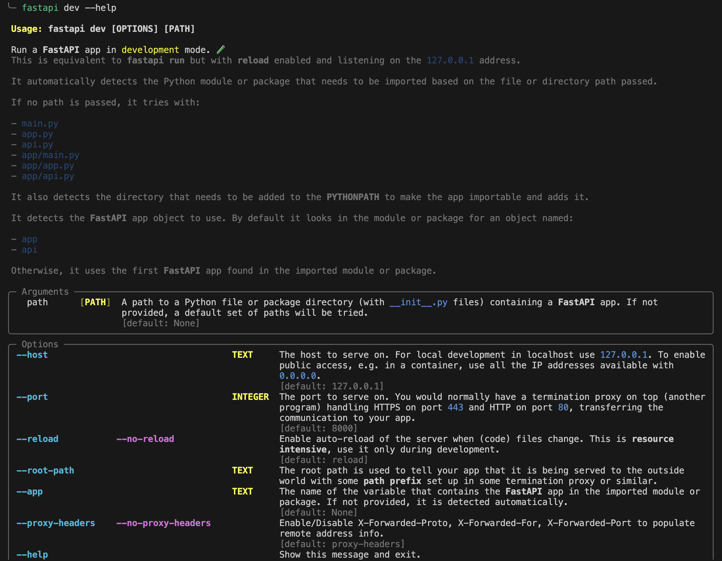 - 자세한 사용방법은 fastapi dev --help를 사용하여 확인 가능하다.