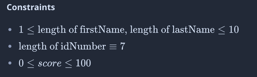 Student(String firstName, String lastName, int idNumber, int[] testScores) {