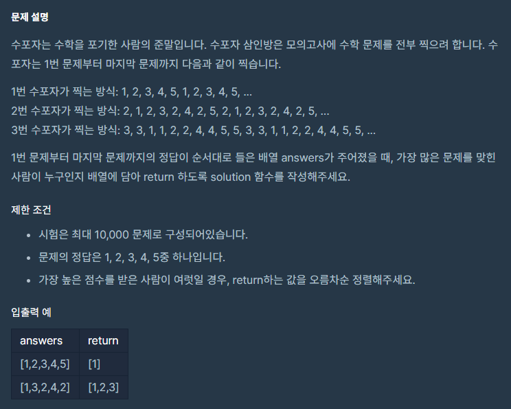 - 문제에서 제시된 1, 2, 3번 학생의 정답의 규칙을 배열로 담는다.
