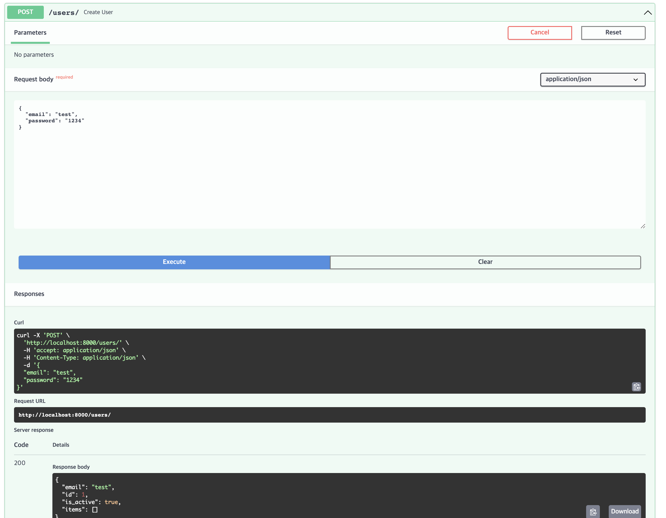 - localhost:8000/docs로 이동하면 Swagger에 문서 자동화 된 것을 확인할 수 있으며 정상적으로 동작하여 DB에 데이터가 들어가는 것까지 확인됩니다.