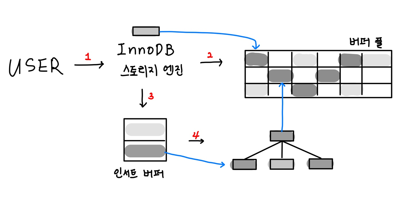 - InnoDB 버퍼 풀에 새로운 키 값을 추가해야 할 페이지(leaf node)가 존재시, 키 추가 즉시 키 추가 작업 처리