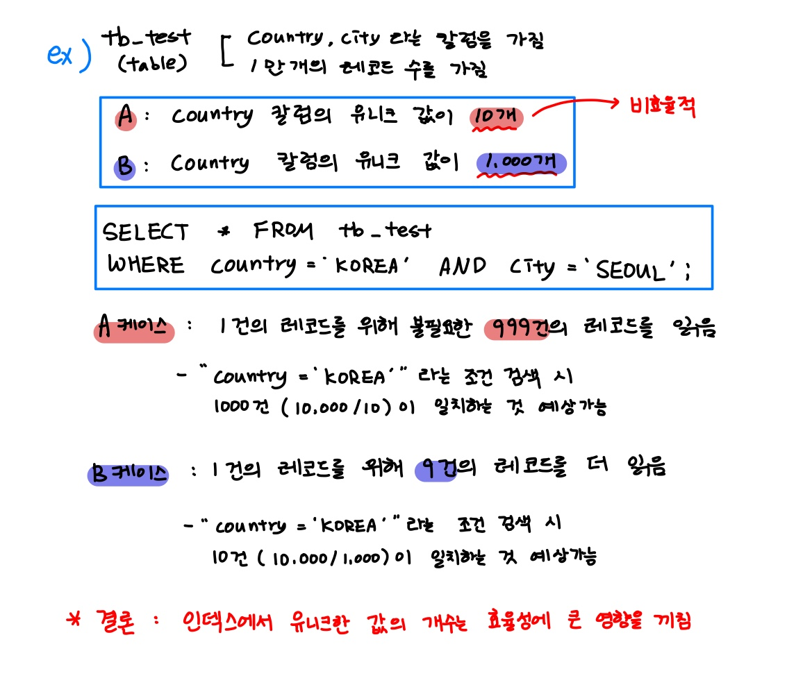 - 인덱스 키값 가운데 중복된 값이 많아지면 많아질수록 기수성은 낮아지며 선택도 떨어짐