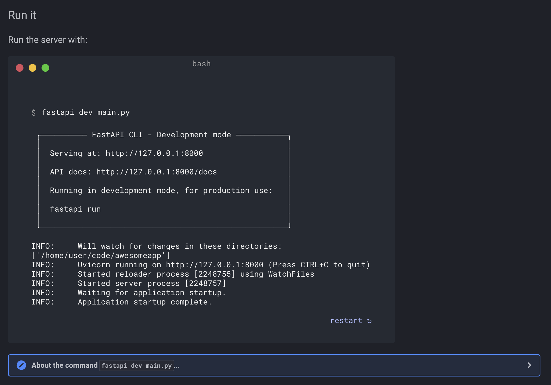 하지만, 현재는 추가된 CLI를 활용하여 보다 쉬운 명령어로 FastAPI 서버를 구동할 수 있게 된 것이다.